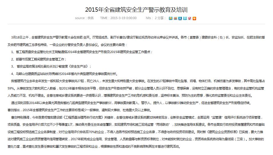 3月18日上午,全省建筑安全生產警示教育大會在合肥 召開。廳黨組成員、副廳長曹劍/建設廳副巡視員陳幼年出席會議并講話。各市(直管縣)建委安全科(處)長、安監站長、在肥注冊的省及合肥市建筑施工總承包...
