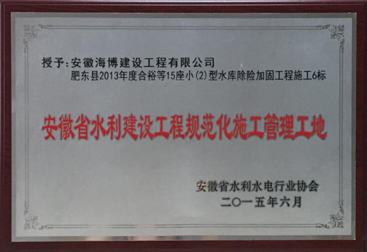 我公司承建的“肥東縣2013年度合裕等15座省級小(二)型水庫除險加固工程6標”獲得 2014年度“安徽省水利建設工程規范化管理工地”的榮譽稱號。 該工程為省級小(2)型水庫除險加固項...
