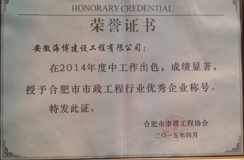 合肥市市政工程2014年度“雙優”評選結果于近日揭曉,安徽海博建設工程有限公司榜上有名,榮獲“2014年度合肥市市政工程優秀企業”稱號。 此次,公司被評選為“優秀企業”,鼓舞了員工的...