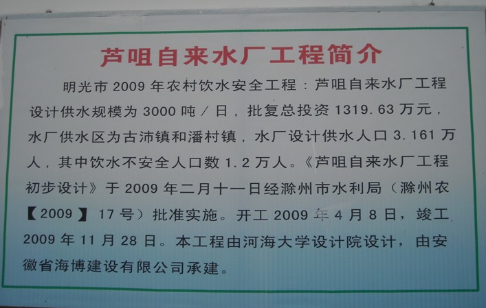 2010年9月4日上午,由滁州市水務局、滁州市發改委、滁州市衛生局等部門組成的“工程竣工驗收專家組”對我公司承建的“明光市蘆咀自來水廠工程”進行竣工驗收。