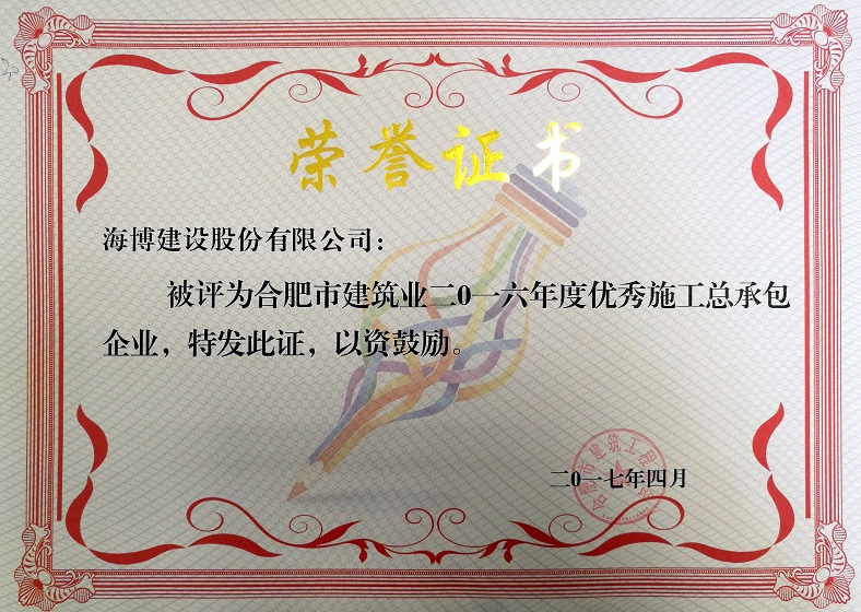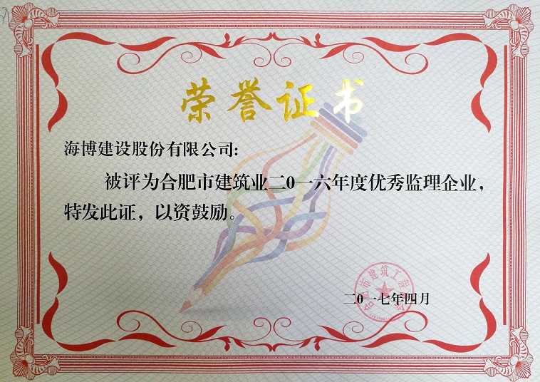 在一年一度的合肥市建筑業(yè)優(yōu)秀企業(yè)評選中,我單位經(jīng)過市建委、市建筑工程協(xié)會的層層評比,最終獲得合肥市建筑業(yè)2016年度“優(yōu)秀施工總承包企業(yè)”及“優(yōu)秀監(jiān)理企業(yè)”雙項榮譽。