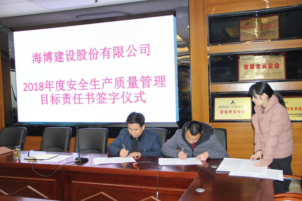 會議還組織了公司法定代表人曹成穩經理與在建項目的項目經理共同簽訂了“2018年度安全生產質量管理目標責任書”,并要求各項目部認真貫徹《落實全員崗位安全生產責任制實施辦法通知》精神,深入開展冬季安全檢查,突出重點,全面排查和整治各類事故隱患,加強重大危險源的安全監控,積極為春節和全國“兩會”營造安全穩定的社會環境。
