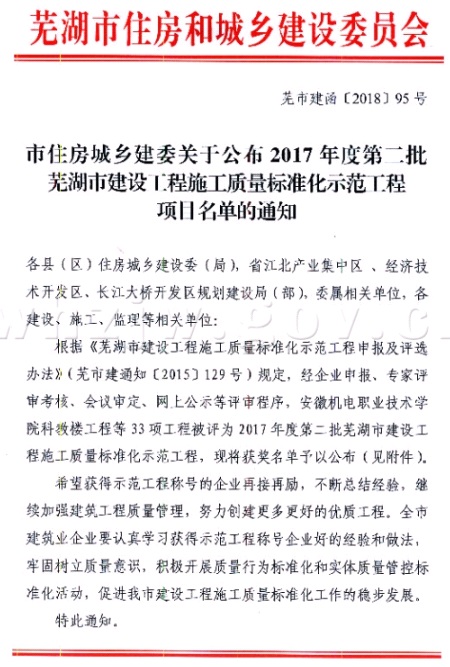 2017月12月15日,由蕪湖市、無為縣建設(shè)工程質(zhì)量監(jiān)督站及相應(yīng)專家組成的評(píng)審組,按照《蕪湖市建設(shè)工程施工質(zhì)量標(biāo)準(zhǔn)化示范工程申報(bào)及評(píng)選辦法》(蕪市建通知[2015]129號(hào)),對(duì)該工程申報(bào)蕪湖市建設(shè)工程施工質(zhì)量標(biāo)準(zhǔn)化示范工程進(jìn)行現(xiàn)場(chǎng)復(fù)審。