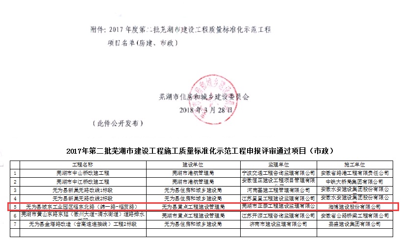 2018年03月28日,蕪湖市住房城鄉(xiāng)建委公布了我公司承建的無為縣城東工業(yè)園區(qū)福東北路(緯一路-福貿(mào)路)工程榮獲“2017年度第二批蕪湖市建設(shè)工程施工質(zhì)量標(biāo)準(zhǔn)化示范工程”稱號(hào)。